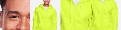11 oz./yd² (US), 18.4 oz./L yd (CA), 70/30 cotton/polyester crossweave fleece Safety Yellow is 50/50 cotton/polyester Team fit Water-repellent Three-piece self-lined hood Dyed-to-match flat braided drawcord at hood Dyed-to-match center front vision zipper Front pouch with media pocket Matching knit trim at cuff and hem Locker loop main label